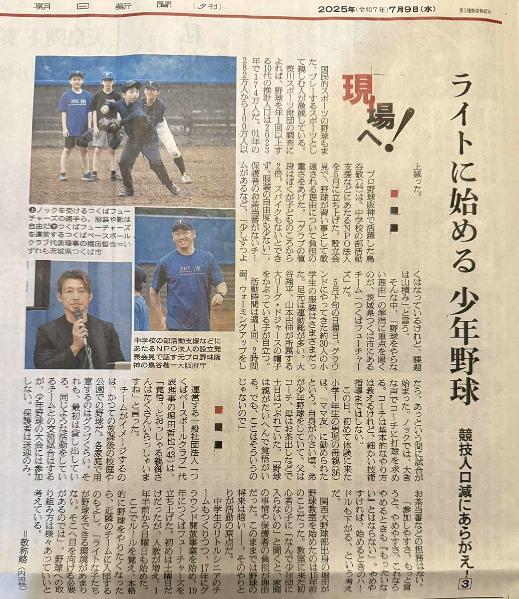 [メディア掲載]朝日新聞(夕刊)に弊クラブが掲載されました「ライトに始める少年野球 現場へ! 競技人口減にあらがえ!(3)」